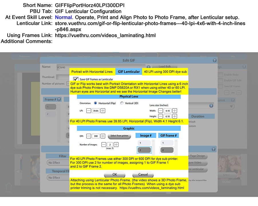 Here is how the PBU (Photo Booth Upload) software creates an Animation or Morph with Horizontal lenticules (lines) using our Photo Frames. The finished product is a Portrait 6 inch Tall x 4 inch Wide with Horizontal Lines Lenticular Animated GIF or Morph. Follow the suggested settings from LA Photo Party on creating a Lenticular GIF or Morph, you set the LPI (lines per inch) at 60.0, (thats correct no integer needed, dead on 60!) You set the width to 4.0 and the height to 6.0 to create a Portrait print to match the lenticules (lines) on the lenticular lens. LA Photo Party used a Primera IP60 Inkjet printer and I used a DNP DS40, DS620A, RX1 using a 4x6 media kit for my tests.